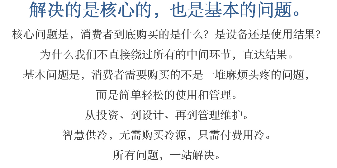 智慧供冷就是在這種背景下產(chǎn)生的中央空調(diào)行業(yè)商業(yè)模式創(chuàng)新,以童叟無欺的單位冷量價格告知中央空調(diào)用戶的全生命使用過程成本,以一個結(jié)果性數(shù)據(jù)跨越了中央空調(diào)用戶對空調(diào)主機及系統(tǒng)其他配套產(chǎn)品性價比的信息不對稱,智慧供冷商業(yè)模式將中央空調(diào)行業(yè)市場競爭引向用戶的使用成本和系統(tǒng)實際運行能效的競爭,是一個真正基于創(chuàng)造用戶價值的創(chuàng)新。