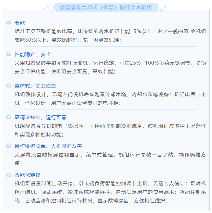 展?jié)摿薮蟆?br /> ![]() 本次出貨印尼的板管蒸發(fā)冷卻式(低溫)螺桿冷水機(jī)組,采用蒸發(fā)式冷凝技術(shù),一體化設(shè)計,省卻了冷卻水塔的安裝,與市面上傳統(tǒng)的低溫空調(diào)機(jī)組相比,處于領(lǐng)先的地位。具有整體性好,能效比高,安裝便利、運行噪音低、性價比高的特點,機(jī)組現(xiàn)場只需接通水、電即可投入使用,有效縮短安裝周期。還可運用多聯(lián)共享技術(shù)進(jìn)一步降低能耗,實現(xiàn)物聯(lián)網(wǎng)遠(yuǎn)程監(jiān)控及管理。設(shè)備可提供-5~-30℃低溫度的工業(yè)用冷凍載冷劑,廣泛應(yīng)用于紡織、化工、食品、電子、科研等廠房的低溫冷源主機(jī)。 ![]() ![]() |